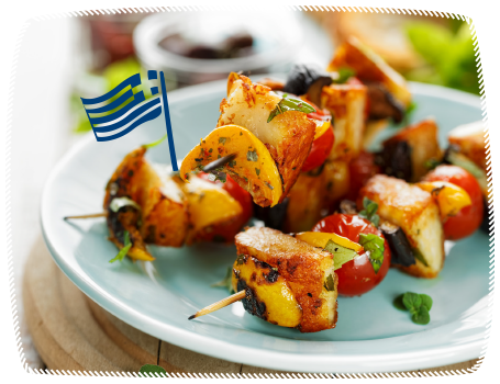 Den Sirtakis Halloumi Grillkäse in 24 gleich große Würfel schneiden. Die Paprikaschoten putzen, halbieren, die Kerne entfernen, waschen und in gleich große Stücke schneiden. Die Zucchini waschen, putzen und in Scheiben schneiden. Die Aubergine waschen und in Scheiben schneiden. Den Knoblauch abziehen und fein würfeln. Thymian und Rosmarin waschen, Blättchen abzupfen, klein schneiden und in einer großen Schüssel mit Olivenöl, Paprikapulver, Salz, Pfeffer, Honig und dem Knoblauch verrühren. Den Sirtakis Halloumi Grillkäse und das Gemüse dazugeben und gut durchmengen. Abwechselnd Grillkäse und Gemüse auf acht Holzspieße stecken. Die Spieße in einer beschichteten Pfanne bei mittlerer Hitze von allen Seiten braten.