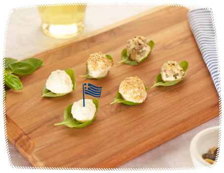 Den Schafskäse so klein wie möglich zerbröseln (evtl. noch mit einem Löffel am Rand der Schüssel zerdrücken), gut mit dem Frischkäse vermischen. Die Mischung mit Pfeffer (am besten frisch gemahlen, ca. 3 Messerspitzen), wenig Salz und Paprikapulver (ca. 1/4 Teelöffel) abschmecken. An dieser Stelle kann auch fein gehackter Knoblauch dazugegeben werden. Jetzt die Masse zu Bällchen formen und in Sesam oder Saat-Mix wälzen. Danach auf Basilikumblatt anrichten.